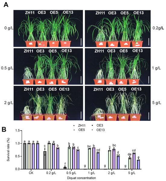 To evaluate resistance to bipyridyl herbicides, we utilized the T3 generation of the representative lines whose homozygosity were confirmed by the absence of segregation in hygromycin resistance. To preliminarily observe the herbicide resistance on culture media, OE3, 5, 13, and the ZH11 control were grown on 1/2 MS media supplemented with 0.3 µM paraquat for 8 days. As shown in Figure S1, all overexpression lines had strikingly higher seedling heights and longer primary roots compared with the wild-type control, which were severely stunted by the herbicide in the media. To compare their resistance to foliar-applicated herbicide, seedlings grown in soil for 25 days were foliar-sprayed with 0.5 g/L paraquat. Ten days after application, leaves of the ZH11 wild type exhibited severe necrosis, whereas all three overexpression lines maintained green foliage with minimal phytotoxicity symptoms (Figure 2A). Quantitative analysis confirmed significantly higher survival rates and more retention of functional green leaves in transgenic lines compared with the wild type (Figure 2B). These findings conclusively demonstrate that constitutive expression of DTX6m confers substantial paraquat tolerance in rice.