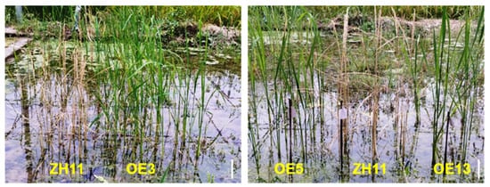 Given the prevalent agricultural usage of diquat as an alternative bipyridyl herbicide to paraquat in many countries, we evaluated diquat resistance in rice plants through multi-stage physiological assessments. Initial screening at the seedling stage employed 25-day-old soil-grown plants subjected to foliar application of diquat at escalating concentrations (0, 0.5, 1, 2, and 5 g/L). Post-treatment evaluation after three days revealed a concentration-dependent response. ZH11 plants exhibited severe chlorosis at all tested concentrations, whereas transgenic lines maintained significant chlorophyll integrity even at 5 g/L (5 × the commercial field application rate) (Figure 3A). Quantitative analysis demonstrated differential tolerance among transgenic lines, with OE3 and OE5 showing significantly stronger resistance compared with OE13 (Figure 3B), correlating with the higher expression levels of DTX6m in OE3 and OE5 (Figure 1). Field validation experiments involved diquat application (2 g/L) at the reproductive stage (2 months post-transplant in the paddy field). Ten days after treatment, ZH11 plants displayed complete systemic necrosis and mortality, while all transgenic lines survived without chlorosis (Figure 4). This translational evidence confirms that DTX6m overexpression confers robust cross-environmental tolerance to diquat.