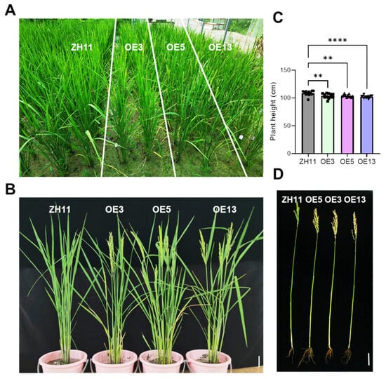 Phenotypes of the transgenic lines in the field. (A) Flowering rice plants in the field. (B) Phenotype comparison of ZH11 and three DTX6m-overexpression lines. (C) Comparison of plant height in the field. Data represent means ± SD (n = 12 plants). One-way ANOVA was performed to analyze the significance of difference between ZH11 and different DTXm-overexpression lines. **** p ≤ 0.0001. ** p ≤ 0.01. (D) Phenotype of the main tiller at day 110 after breeding. Scale bar = 10 cm.