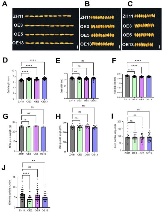 Comparative analyses of the grain size and yield traits of ZH11 and DTX6m-overexpression lines. (A) Grain length. (B) Grain width. (C) Grain thickness. (D) Statistical analysis of the grain length. (E) Statistical analysis of the grain width. (F) Statistical analysis of the grain thickness. In (D–F) Data represent means ± SD (n = 65 seeds from different plants). (G) Statistical analysis of 1000-grain weight (n = 3). (H) Statistical analysis of the main panicle length (n ≥ 10). (I) Statistical analysis of the grain number per panicle (n ≥ 22). (J) Statistical analysis of the effective panicle number (n ≥ 38). One-way ANOVA was used to analyze the significance of difference between ZH11 and different DTXm-overexpression lines. **** p ≤ 0.0001. ** p ≤ 0.01. In (A–C), Scale bar = 5 mm.