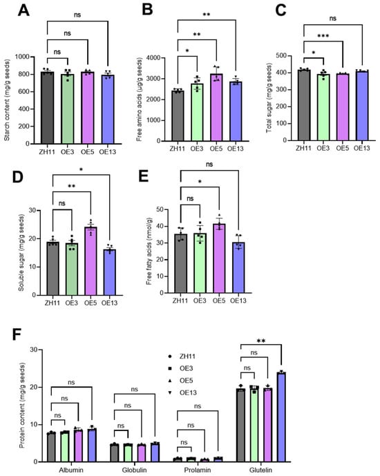 Rice seeds, as a staple food, serve as a source of carbohydrates, proteins, and lipids for human consumption. To determine whether the overexpression of DTX6m altered the nutritional quality of rice seeds, we analyzed the levels of starch, total sugar, soluble sugars, free lipidic acids, free amino acids, and proteins in transgenic rice lines. The results revealed that the transformation of DTX6m did not change the starch content (Figure 7A), but did elevate the free amino acid levels in all three transgenic lines (Figure 7B). Regarding the total sugar, soluble sugar, and free lipidic acid levels, there were no consistent changes in the three transgenic lines (Figure 7C–E), suggesting that their content might have been affected by factors other than DTX6m. The protein content, including albumin, globulin, prolamin, and glutelin levels, remained unchanged in the transgenic lines (Figure 7F). Among the three DTX6m-overexpression lines, OE5 performed exceptionally well (Figure 7A–E), exhibiting significantly higher levels of free fatty acids, free amino acids, and soluble sugar compared with ZH11.