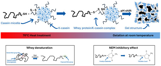 Before acidification, milk proteins are often heated above 70 °C, causing whey proteins to denature and interact with casein micelles, particularly through hydrophobic interactions and covalent disulfide bonds involving κ-casein [13,14]. High-temperature treatments above 70 °C lead to high-molecular-weight complexes between denatured whey proteins and κ-casein, which remain partly associated with casein micelles [15]. Subsequently, acidification occurs, causing caseins to precipitate and form a gel matrix. Disulfide bridges and free thiol groups are crucial in this process, determining the gel strength [16,17]. β-Lg is the main source of thiol groups in milk. Its structure consists of disulfide bridges and a free thiol group inside the structure that becomes exposed after thermal unfolding, making it reactive [18,19,20]. Figure 1 shows the interaction between denatured β-Lg and casein micelles. NEM blocks this process by inhibiting the thiol groups of β-Lg, preventing further cross-linking.