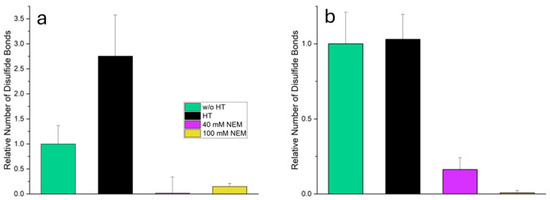 In the total system, heat-treated MC shows a significant increase (p ≤ 0.05) in the number of disulfide bridges (2.7 times compared to untreated MC) suggesting pronounced heat-induced cross-linking. However, in the samples with added NEM (heat-treated MC + 40 mM NEM and heat-treated MC + 100 mM NEM) the measured number of reducible disulfide bridges is almost zero. This confirms that alkylation by NEM has successfully blocked the thiol groups, thereby preventing their detection by Ellman’s reagent.