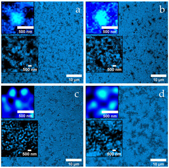 Confocal fluorescence micrographs of casein acid gels from casein micelles (a) without temperature treatment, (b) with temperature treatment, (c) with temperature treatment and 40 mM added NEM, and (d) with temperature treatment and 100 mM added NEM. In each image, insets (1 µm × 1 µm and 5 µm × 5 µm) highlight the typical microstructure at higher magnification, allowing a detailed visualization of the aggregate morphology and substructure.