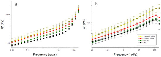 G″ (Figure 4b) also increases linearly in the double-log plot for all samples up to 100 rad/s. The untreated gel and the heat-treated gel without NEM show almost identical behaviors, while the gels with NEM again (40 mM and 100 mM) show higher G″ values. The highest G″ values are observed in the gel with 100 mM NEM.