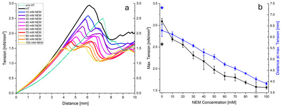In addition to the descriptive analysis, we analyzed all force–displacement curves obtained at varying NEM concentrations by non-linear simultaneous fitting of Equations (3)–(5). We implemented these equations and fitted them to the data using SigmaPlot 14.0 (Systat Software Inc., San Jose, CA, USA). This novel modelling approach is introduced and elaborated upon further in the Results section (see Section 2.3 and Figure 6).