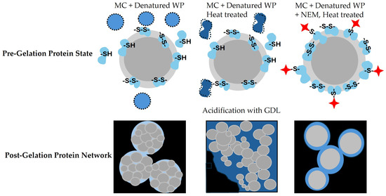 Schematic representation of the protein states before and after the acid-induced gelation of micellar casein-based systems. The upper row illustrates the structural organization of micellar casein (MC), denatured whey proteins, and their interactions prior to gelation under different treatments. NEM blocks free thiol groups as indicated by red stars. The lower row shows the resulting gel microstructures after acidification.