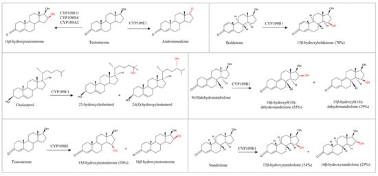 CYP109A2 from B. megaterium, in a similar fashion to CYP109E1, oxidizes testosterone in a highly regio- and stereoselective manner to 16β-hydroxytestosterone (Figure 1) [] and also hydroxylates vitamin D3 to 25-hydroxyvitamin D3 []. CYP109B4 from Bacillus sonorensis oxidizes testosterone to 16β-hydroxytestosterone (Figure 1) []. A detailed functional characterization of CYP109B1 from Bacillus subtilis has been conducted, elucidating its regio- and stereoselectivity toward various steroids. CYP109B1 oxidizes testosterone and boldenone to produce their 15β-hydroxylated forms with a 70% product yield. In the case of nandrolone, two oxidized products are formed: the 15β-hydroxylated nandrolone is the primary product, while the 16β-hydroxylated nandrolone is produced in smaller amounts (29%) (Figure 1) []. However, in the case of 9(10)dehydronandrolone, the 16β-hydroxylated product is the primary product (55%), and the 15β-hydroxylated product is the minor product (29%) (Figure 1) []. Furthermore, CYP109B1 oxidizes valencene to nootkatol and nootkatone, compounds that are used in perfumes, food flavoring, and as insecticides, and it converts compactin to pravastatin, important classes of cholesterol-lowering agents (statins) [].