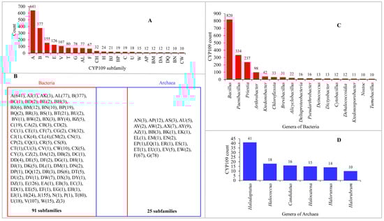 Analysis of CYP109 genes in bacteria and archaea. (A) Comparative analysis of CYP109 subfamily members. (B) Comparative analysis of CYP109 subfamilies between bacteria and archaea. The number in brackets denotes the number of members in that subfamily. (C) Comparative analysis of CYP109s among bacterial genera. (D) Comparative analysis of CYP109s among archaeal genera. In panels (A,C,D), the numbers next to bars indicate the number of members for a particular subfamily (for (A)) and in the particular genera (in (C,D)). Only members with more than 10 for a subfamily or genus are shown in panels (A,C,D). Detailed information is presented in Tables S2 and S3.
