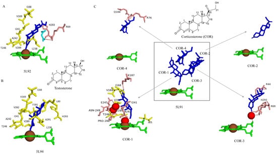 Analysis of CYP109E1 interactions with steroids such as corticosterone (COR) (A,C) and testosterone (B). Heme is shown in green, iron is shown as a brown sphere, steroids are shown in blue, and malonic acid is shown in cyan. Amino acids sharing van der Waals and hydrophobic interactions are shown in yellow, and amino acids sharing a direct and water-mediated interaction with the ligand are shown in salmon. Polar interactions are red dashed lines, and water molecules are red dots (4C-COR-1 and COR-3). Amino acid residues are labeled according to their single-letter codes. PDB codes are written under each modeled protein structure. Amino acids found within 5 Å of the ligands are listed in Table 4. The chemical structures of COR and testosterone are also shown in the figure.
