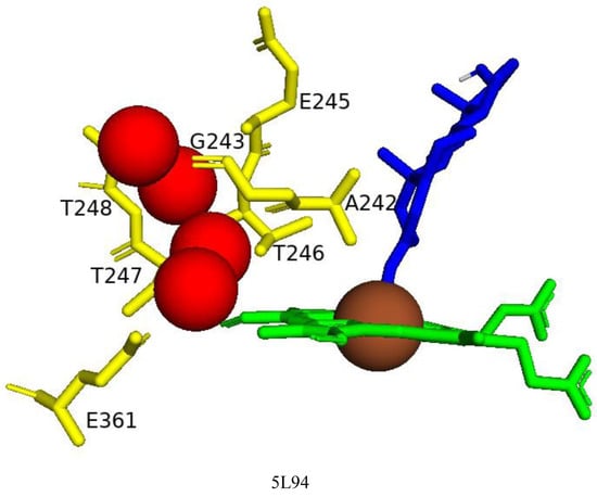 Analysis of the CYP109E1–testosterone crystal structure complex revealed a proton shuttle network that transfers electrons for catalysis (Figure 5) []. In the active site cavity, four water molecules create a continuous hydrogen-bonded network with the main-chain carbonyls of Ala242 and Gly243, the side-chain hydroxyl groups of Thr246 and Thr247, and the main-chain amide of Thr248 forming this network []. Amino acid mutation analysis revealed that only the T246A variant resulted in the loss of catalytic activity, and no loss of activity was observed for the G245A variant, indicating that only Thr246 plays a key role in the proton transfer required for catalysis []. The proton shuttle network system was also identified in other P450s, such as CYP107, where Ala245 was found to play a key role [].