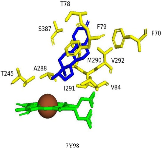 Analysis of CYP109B4 interactions with testosterone. Heme is shown in green, iron is shown as a brown sphere, and the ligand is shown in blue. Amino acids sharing hydrophobic interactions with the ligand are shown in yellow. Amino acid residues are labeled according to their single-letter codes. PDB codes are written under the modeled protein structure. Amino acids found within 5 Å of the ligands are shown in Table 4.