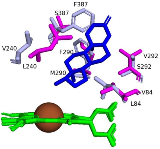 Structure-guided mutagenesis was successfully employed in changing the regioselectivity of CYP109B4 catalysis []. Multiple sequence alignment and active site superimposition of CYP109B4 with different CYP109Bs, especially with CYP109B1, which hydroxylates testosterone at the 15β-position [], identified three amino acids, Val84, Val292, and Ser387, as key for CYP109B4 regioselectivity []. Subsequent site-directed mutagenesis studies of these residues further confirmed their role in catalytic regioselectivity. Variants of V84I and V292R showed that the 15β-selectivity increased while the activity decreased []. The S387V variant exhibited a noticeable decrease in both activity and 15β-selectivity compared with wild-type CYP109B4 []. Extensive analysis of different variants of CYP109B4 finally resulted in the generation of a variant named B4-M7 (L240V/S387F/V84L/V292S/I291T/M290F/F294I) that completely switched regioselectivity from the 16β to 15β position (Figure 7). A schematic diagram representing the superimposition of the wild-type and variant amino acids of CYP109B4 that determine the regioselectivity is shown in Figure 7.