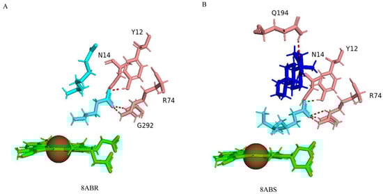 In the second CYP109A2 crystal structure complex, a testosterone molecule occupies the ligand position far from the heme, while 4,6-dimethyloctanoic acid was modeled as the ligand near the heme (Figure 8B) []. The bound testosterone molecule is primarily stabilized by hydrophobic interactions []. These interactions occur between its carbon ring skeleton and a set of residues like those that bind the distant fatty acid, octanoic acid []. Additionally, testosterone C3-keto oxygen forms a hydrogen bond with the side chain of Gln194, and the C17-hydroxyl group forms water-mediated hydrogen bonds with the side chain of Arg186 and the main-chain carbonyl of Leu167 (Figure 8B) []. Since the crystal structures did not result in the productive position of testosterone, the molecular docking of testosterone and VD3 coupled with molecular dynamics simulation was performed to achieve the productive complex and to identify amino acids playing a key role(s) in substrate binding or catalysis. The productive CYP109A2 complex with VD3 and testosterone revealed that a specific core of amino acids keeps both steroids bound in a productive binding position, despite these steroids binding in different conformations in the enzyme active site. The core of amino acids includes six apolar and three polar/charged amino acids that stabilize the steroid binding []. The nine amino acids of the core are Tyr12, Asn14, Glu78, Leu84, Met85, Arg186, Leu237, Ile288, and Phe389. The majority of these residues form hydrophobic and van der Waals contacts with the steroids. Asn14, Glu78, and Arg186 form hydrophobic interactions and generate hydrogen bonds for stabilizing the C3 polar substituent of the steroids. Furthermore, Ala241 and Thr245 are also found to be important for productive binding of testosterone []. One surprising finding of this study is the role of Arg74. A variant of Arg74Val resulted in the loss of hydroxylation activity, indicating its importance in catalysis.