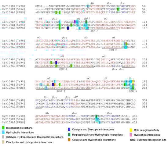 The comprehensive crystal structure analysis of CYP109 members revealed amino acids that play key roles in substrate binding, orientation, and catalysis and are involved in regio- and stereospecific hydroxylation of steroids (Figure 9). This study identified that the CYP109 members’ active sites are large enough to accommodate both structurally different and multiple ligands. The RMSD value for CYP109 members revealed significant shifts in amino acid positions affecting their activity and substrate selectivity. The molecular flexibility of CYP109 members is comparable to that of CYP107 family members []. Amino acid residues in the active site of CYP109 members that share hydrophobic and polar interactions with substrates play vital roles in substrate binding orientation and specificity (Figure 9). The substitution of amino acids within the binding pocket of CYP109 proteins revealed significant effects on their catalytic activity and selectivity. One of the important findings revealed that sequence-guided mutational analysis resulted in the generation of a variant CYP109B4 (named B4-M7) that completely switched the oxidative regioselectivity from the 16β to the 15β position, indicating significant progress in understanding the factors governing P450 catalysis and thus allowing for P450 design for the synthesis of specific steroids. The majority of the CYP109 amino acids involved in various interactions with ligands, proven to play roles in catalysis and regio- and stereoselectivity, are found in different substrate recognition sites (SRSs) (Figure 9).