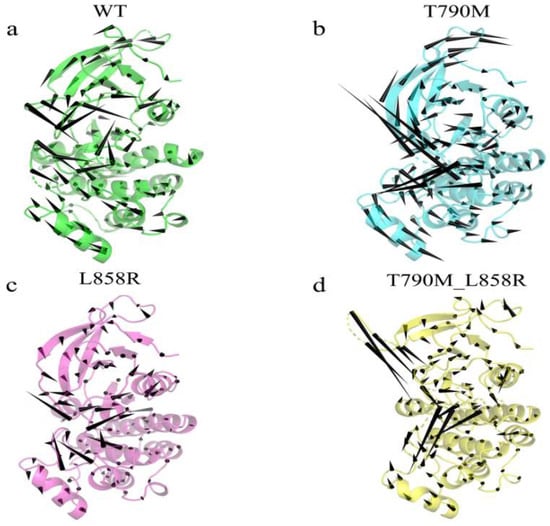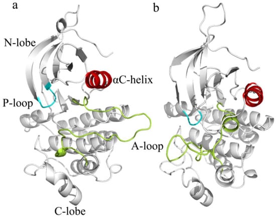 - Shan, Y.; Eastwood, M.P.; Zhang, X.; Kim, E.T.; Arkhipov, A.; Dror, R.O.; Jumper, J.; Kuriyan, J.; Shaw, D.E. Oncogenic mutations counteract intrinsic disorder in the EGFR kinase and promote receptor dimerization. Cell 2012, 149, 860–870. [Google Scholar] [CrossRef]