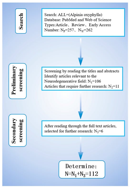 This study retrieved data from the PubMed and Web of Science databases without time restrictions. After multiple trials, the search strategy “ALL = (Alpinia oxyphylla)” was chosen to ensure comprehensiveness, accuracy, and authority. Specifically, the Web of Science Core Collection was selected for Web of Science indexing.