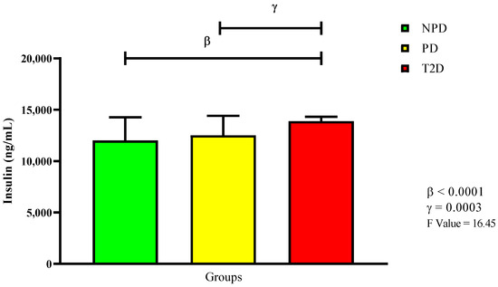 Insulin plasma concentration in non-prediabetic (NPD), prediabetic (PD), and type 2 diabetic (T2D) participants (n = 40, per group). Values are expressed as mean ± SD. β denotes comparison of NPD with T2D. γ denotes comparison of PD with T2D.