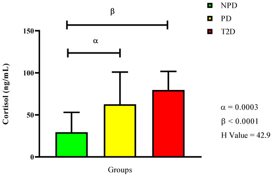 Cortisol plasma concentration in non-prediabetic (NPD), prediabetic (PD), and type 2 diabetic (T2D) participants (n = 40, per group). Values are expressed as follows: NPD median is 45.7 (11.5), PD median is 53.1 (19.7), and T2D median is 62.0 (10). α denotes comparison of PD with NPD. β denotes comparison of NPD with T2D. IQR (75–25th).