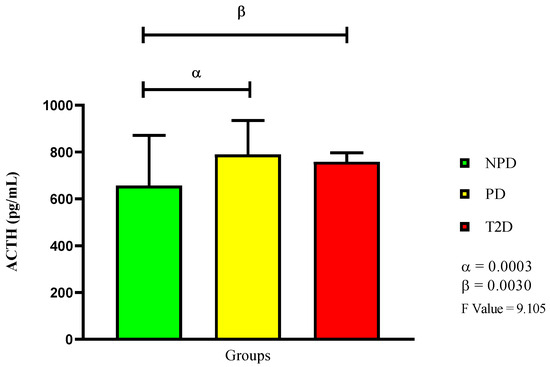 ACTH plasma concentration in non-prediabetic (NPD), prediabetic (PD), and type 2 diabetic (T2D) participants (n = 40, per group). Values are expressed as mean ± SD. α denotes comparison of NPD with PD. β denotes comparison of NPD with T2D.