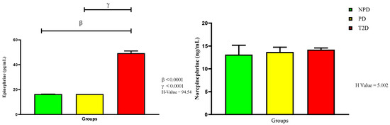 For this study, we further measured plasma catecholamines—epinephrine and norepinephrine—as presented in Figure 4. The results show that there were no significant changes between the NPD and PD groups. However, there was a significant increase in the epinephrine concentration in the T2D group compared to the NPD (p < 0.0001) and PD groups (p < 0.0001). The norepinephrine concentrations in all three groups were similar when each group was compared to the other.