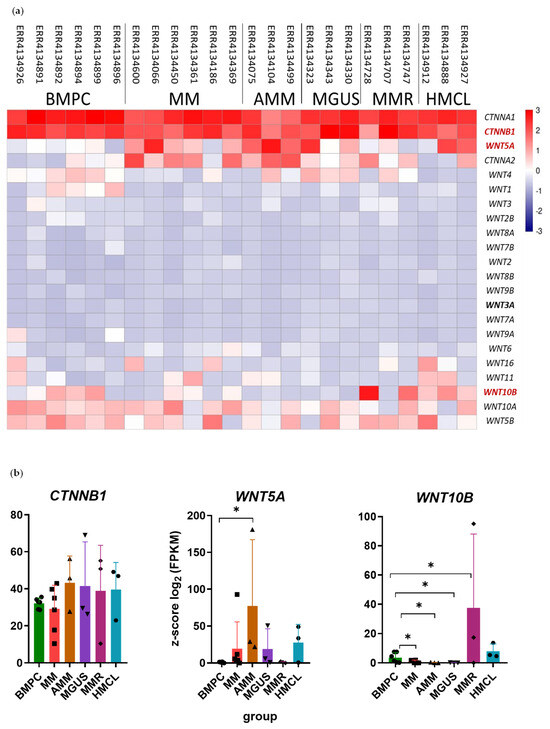 (a) Differential expression of WNT family genes and CTNNA1, CTNNA2, and CTNNB1 genes. Run accession numbers in the SRA database are shown above. The color scale shows z-score values calculated for each gene (shown on the right); (b) differential expression of WNT5A, WNT10B, and CTNNB1 genes plotted as bars with individual values (shown as dots). Data represented as mean ± SD. * p < 0.05. The Y-axis shows z-score values. The X-axis—groups of samples (BMPC—healthy BM PCs; MM—symptomatic MM; AMM—asymptomatic MM; MGUS—monoclonal gammopathy of undetermined significance; MMR—relapsed MM; HMCL—human myeloma cell lines).