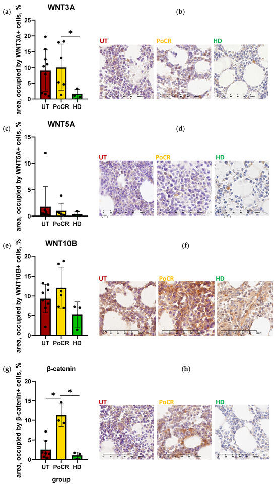 WNT10B was identified in a relatively high number of cells across all groups, with a range from 1.47 to 18.04% of the total area. There were no statistically significant differences between groups; however, the percentage of area stained with the AB against WNT10B was higher in most specimens from MM patients than from HD (Figure 2e,f). The level of β-catenin was significantly increased in the specimens from patients with PoCR compared to both UT and HD (Figure 2g,h).