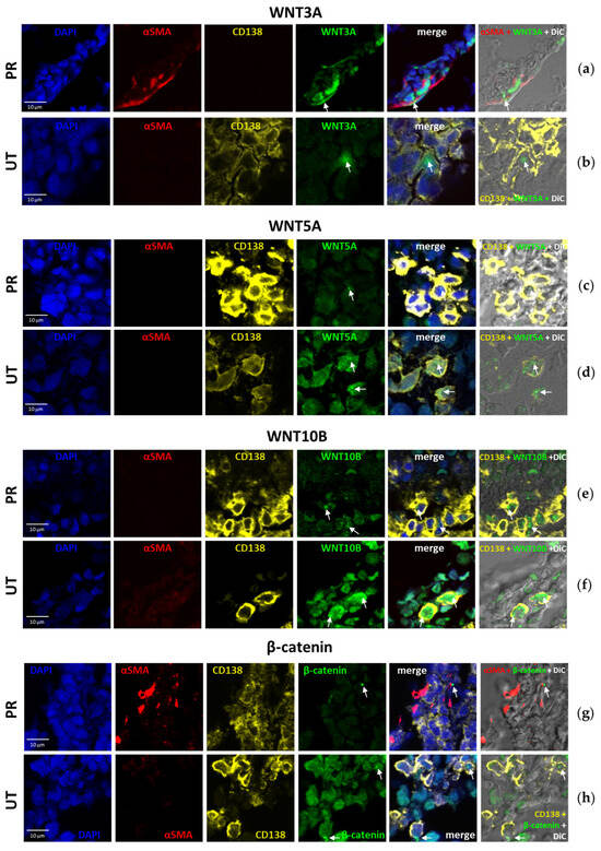 Multiplex TSA staining of BM trephine biopsies to detect WNT3A (a,b), WNT5A (c,d), WNT10B (e,f), and β-catenin (g,h) localization. Fluorescence images were obtained by confocal microscopy. DiC is an image obtained by the differential contrast method. Nuclei are stained with DAPI (blue); MSCs—with AB against α-SMA (red); PCs—with AB against CD138 (yellow); WNTs and β-catenin—with appropriate ABs (green). Merge—combined image of fluorescence signals of each band used. On the right, there are the results of combining the DiC image with the indicated fluorescent channels. The scale (10 μm) is indicated in the figure. White arrows indicate WNTs or β-catenin.