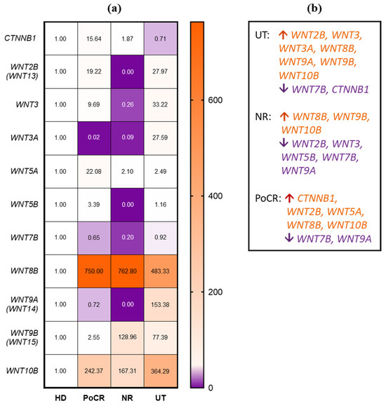 (a) Heatmap representing the evaluation of transcription levels of WNT and CTNNB1 genes in MSC cultures by qPCR. The color scale shows the ratio to HD. In each row, the HD mRNA level for the specified gene was set as 1 (white color). The upregulated (orange) and downregulated (violet) genes for each group are shown to the right of the heatmap. (b) A summary of data in (a) expression patterns of WNTs and CTNNB1 mRNAs in MSC cultures obtained from patients with different response to therapy. Orange (up arrows)—upregulation; violet (down arrows)—downregulation.