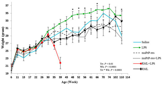 Monthly body weight measurements (mean ± SEM) of female FVB/N mice in six treatment groups—saline (negative control), bacterial lipopolysaccharide (LPS), mouse recombinant proteinase K-resistant prion protein (moPrPRes), moPrPRes + LPS, Rocky Mountain Laboratory strain (RML) (positive control), and RML + LPS—monitored from 6 weeks of age until study endpoint. LPS or saline was continuously administered for six weeks via ALZET® osmotic mini-pumps (ALZET, Cupertino, CA, USA), while a single subcutaneous injection of either moPrPRes or RML was given at the time of pump implantation. Statistically significant differences in body weight were observed at multiple time points: LPS-treated mice weighed more than RML-treated mice at 35, 39, 43, 48, 52, and 66 weeks; more than saline controls at 48, 52, 56, 66, and 110 weeks (marked with an asterisk); more than RML + LPS mice at 35 and 39 weeks; more than moPrPRes mice at 43, 48, 52, 56, 61, 66, 70, and 74 weeks; and more than moPrPRes + LPS mice at 39, 43, 48, 52, 56, 61, 66, 70, 74, 102, and 110 weeks. Additional significant comparisons included moPrPRes vs. RML (35 weeks), moPrPRes vs. RML + LPS (35 and 39 weeks), moPrPRes + LPS vs. RML + LPS (39 weeks), moPrPRes + LPS vs. saline (56 and 70 weeks), RML vs. RML + LPS (39 weeks), and RML + LPS vs. saline (39 weeks).