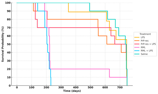 Survival analysis of terminally sick FVB/N female mice. All mice were monitored for clinical signs of prion disease until 750 days post-inoculation and were subsequently euthanized or found dead after maintaining clinical signs for a minimum of 72 h. Negative controls (saline-treated animals) exhibited no clinical signs of prion disease, with all being found dead in the cage without prior symptoms. Most treated animals were euthanized or found dead with clinical signs resembling prion disease. Twenty percent of the RML positive controls survived until the termination of the experiment. The combination of RML with LPS caused earlier mortality (within 100–150 days), with all mice dead by 200 days. Sixty percent of the moPrPres-treated mice died before termination, with four showing clinical signs of neurodegeneration. The moPrPres + LPS treatment group had a mortality rate of 50%, with three mice showing clinical signs. Additionally, 40% of the LPS-treated animals exhibited clinical signs and were subsequently euthanized.