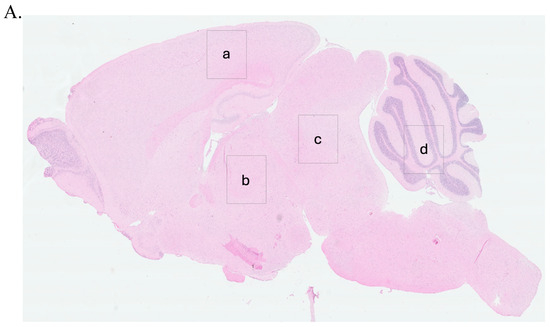 Brain tissues were processed for hematoxylin and eosin (H&E) staining according to the protocol described by Chishti et al. [39]. Formalin-fixed tissues were embedded in paraffin (Formula “R” paraffin, Surgipath®, Leica Biosystems, Nussloch, Germany) and sectioned coronally. Sections were mounted on adhesive-coated glass slides and dried overnight at 37 °C. Deparaffinization was performed using xylene followed by rehydration through a graded ethanol series and deionized water. Slides were stained with filtered Mayer’s hematoxylin (Fisher Scientific, Waltham, MA, USA), counterstained with eosin Y, and dehydrated. Digital images of stained sections were captured using the NanoZoomer XR digital slide scanner (Hamamatsu Photonics, Shizuoka, Japan).