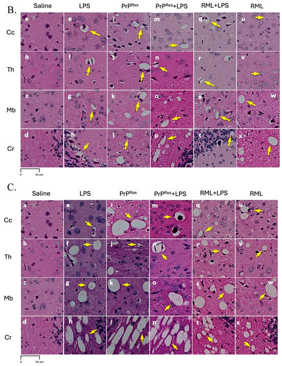 Prion-like vacuolation in hematoxylin and eosin (H&E) stained brain sections of FVB/N wild-type female mice at early (11 weeks postinfection) and terminal stages. (A) shows the anatomical representation of the brain indicating the primary regions analyzed: (a) Cerebral Cortex (Cc), (b) Thalamus (Th), (c) Midbrain (Mb), and (d) Cerebellum (Cr). These regions correspond to panels (a–x) presented in (B,C). (B) presents representative H&E-stained brain sections from mice at early stages (11 weeks post infection), treated subcutaneously for 6 weeks with saline (a–d), LPS (Escherichia coli O111:B4) (e–h), moPrPRes (i–l), moPrPRes + LPS (m–p), RML + LPS (q–t), or RML alone (u–x). (C) illustrates H&E-stained brain sections from terminally sick mice subjected to the same treatments and analyzed across the same regions: Cc (a, e, i, m, q, u), Th (b, f, j, n, r, v), Mb (c, g, k, o, s, w), and Cr (d, h, l, p, t, x). Yellow arrows highlight vacuolation in the brain parenchyma. Panels in both (B,C) are organized by treatment group to allow direct comparison of vacuolation patterns and severity at early and terminal stages. Vacuolation was more extensive in moPrPRes- and LPS-treated groups, particularly in terminal disease (C). (A) provides anatomical reference for both histological panels. Quantitative data and statistical analyses are provided in Section 2.4. Scale bar = 50 μm.