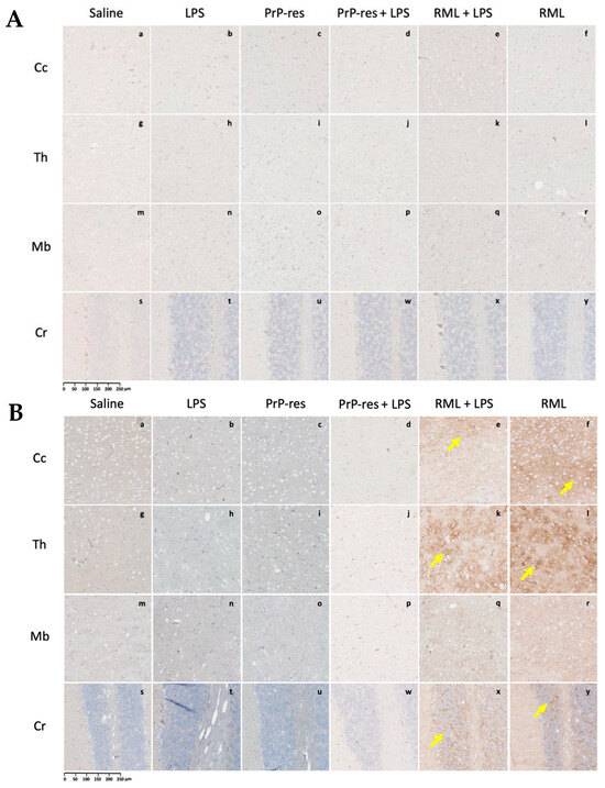 Mice receiving combined moPrPRes + LPS treatment exhibited no clinical signs of disease at 11 wpi. Histopathological evaluation revealed mild vacuolation in the Cc, Th, Mb, and Cr, comparable to those observed in the LPS-only and moPrPRes-only groups and absent in saline controls (Figure 3B, panels m–p). Immunohistochemical staining for PrPSc showed no detectable deposition in any brain region at this stage (Figure 4A, panels m–p), mirroring the PrPSc-negative profiles of the saline, LPS, and moPrPRes groups.