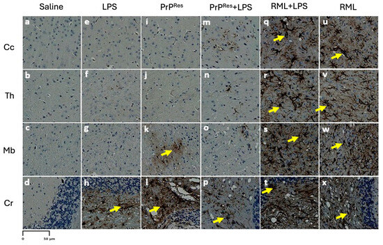 Astrogliosis in immunohistochemically stained sections of the brains of terminally sick FVB/N wild-type female mice. Representative stained brain sections from mice treated subcutaneously for 6 weeks with saline (a–d), LPS (Escherichia coli O111:B4) (e–h), moPrPRes (i–l), moPrPRes + LPS (m–p), RML + LPS (q–t), or RML alone (u–x). Brain regions analyzed include the cerebral cortex (Cc; a, e, i, m, q, u), thalamus (Th; b, f, j, n, r, v), midbrain (Mb; c, g, k, o, s, w), and cerebellum (Cr; d, h, l, p, t, x). The anatomical locations of these brain regions are illustrated in Figure 3A for reference. Astrogliosis was most prominent in the RML + LPS (q–t) and RML-alone (u–x) groups, while the saline, LPS, moPrRes, and moPrPRes + LPS groups (a–p) exhibited minimal to moderate astrogliosis, primarily in the cerebellum. Yellow arrows point to astrocytes. Quantitative data and statistical comparisons are provided in Section 2.4. Scale bar represents 50 μm.