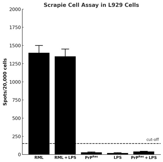 The scrapie cell assay was performed based on the standard protocol described by Mahal et al. [25], with minor adaptations. L929 mouse fibroblast cells (ATCC, Manassas, VA, USA) were used as the permissive cell line for prion infection. Brain homogenates (10% w/v in 1× PBS) were prepared from various treatment groups, including saline (negative control), Escherichia coli O111:B4 LPS, moPrPRes, moPrPRes + LPS, RML + LPS, and RML (positive control). Thirty microliters of each homogenate were aliquoted into wells of a 96-well tissue culture plate (Corning Costar, Tewksbury, MA, USA) and serially diluted (0.1% to 0.0001%) in six replicates.