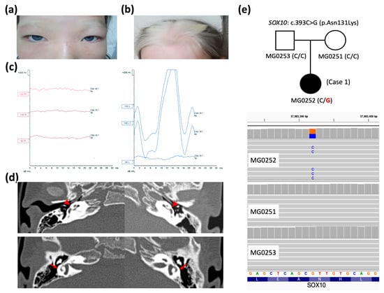 Clinical features, imaging, and genetic data of Case 1. (a,b) Dystopia canthorum, white forelock, and heterochromia iridis, as seen in the clinical photographs. (c) Evidence of profound sensorineural hearing loss (>100 dB) identified in auditory brainstem response examinations. (d) Bilateral flattened cochleae (red arrowheads) and dysplastic semicircular canals with small central bony islands (red arrows) are shown in high-resolution computed tomography of the temporal bone. (e) Pedigree of Case 1 (affected patient colored in black) showing a de novo SOX10 variant c.393C>G (wild-type nucleotide in black and variation in red at – strand of hg38 genome) confirmed via whole-exome sequencing (wild-type nucleotide in orange and variation in blue at + strand of hg38 genome).