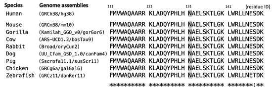 Multiple sequence alignment of the SOX10-encoded protein across different species in the flanking regions of Asn131 (colored in gray). Asterisks (*) denote the fully-conserved position with the same residue; colon (:) indicate the highly-conserved position with residue in similar properties.