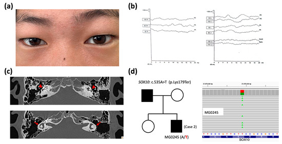 Clinical features, imaging, and genetic data of Case 2. (a) Dystopia canthorum observed in a clinical photograph. (b) Profound sensorineural hearing loss (>100 dB) in auditory brainstem response examinations. (c) Bilateral flattened cochleae (red arrowheads) with cochlear implant electrodes inside and dysplastic semicircular canals (red arrows) are shown in high-resolution computed tomography of the temporal bone. (d) Pedigree of Case 2 (affected patients in black) showing a heterozygous SOX10 variant c.535A>T (wild-type nucleotide in black and variation in red at – strand of hg38 genome) confirmed via whole-exome sequencing (wild-type nucleotide in red and variation in green at + strand of hg38 genome).