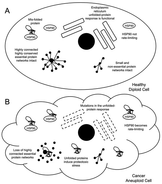 Cancer cell aneuploidy induces proteotoxic stress. (A) In healthy cells, HSP90 is not rate-limiting, the unfolded-protein response is functional, and essential networks, denoted by the highly connected black dots, remain intact and functional. (B) Cancer cells display proteotoxic stress. Stoichiometric imbalances saturate HSP90 with unfolded proteins. Aneuploidy selects for mutants in the unfolded-protein response system that releases cells from growth suppression. A loss of HSP90 function does not affect all cellular pathways equally; rather, essential, highly conserved, and highly connected proteins in dense protein networks are the most vulnerable to HSP90 depletion.