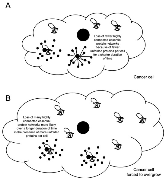 Forced overgrowth, by extending the duration of the cell division cycle, may enhance the effects of proteotoxic stress. (A) For comparison, a cancer cell with an unmanipulated cell division cycle may retain functional essential protein networks, as denoted by highly connected black dots, and viability. (B) If cancer cells produce more protein per single cell division cycle, this will likely increase the level of unfolded proteins per individual cell. Although the molar concentration of unfolded proteins per volume may not change, the increased number of unfolded proteins will increase the likelihood that essential highly conserved protein networks will become dysfunctional, indicated by a loss of connections between the dots, leading to cell death. Extending the cell division cycle duration will increase the amount of time per individual cell that an unfolded protein can disrupt and damage an essential protein network, leading to cell death.