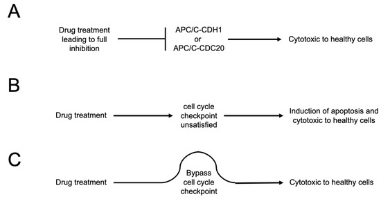 Figure 5. When targeting the APC/C to suppress—but not inhibit—its activity, it is important not to cause checkpoints to become unsatisfied or to prematurely satisfy them, causing a bypass of the cell cycle checkpoint. (A) The inhibition of APC/C activity will be a cytotoxic lethal event in healthy cells. (B) Causing a cell cycle checkpoint to become unsatisfied will promote apoptosis in healthy cells and will be a cytotoxic lethal event in healthy cells. (C) Bypassing a cell cycle checkpoint, by promoting pre-mature satisfaction of the checkpoint, will be a cytotoxic lethal event in healthy cells. - (ii)