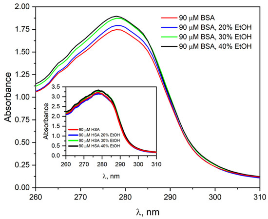 Absorption spectra of the neat BSA solution (90 µM) and containing 20, 30, and 40% EtOH (vol.). Inset. Absorption spectra of the HSA solution (90 µM) before and after adding different amounts of ethanol: 20, 30, or 40% (vol.).