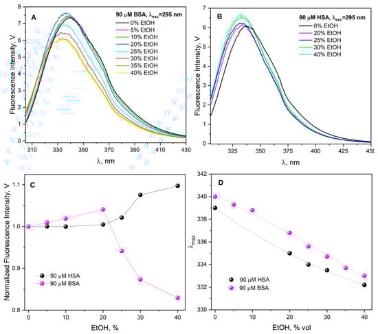 (A) Emission spectra of an aqueous solution of BSA (90 µM) recorded before and after adding EtOH (0–40% vol.). (B) Emission spectra of an aqueous solution of HSA (90 µM) recorded before and after adding EtOH (0–40% vol.). (C) Normalized maximum of fluorescence intensity of Trp in 90 µM HSA solution (black dots) and in 90 µM BSA solution (magenta dots) as a function of EtOH concentration. In both cases, the excitation wavelength was 295 nm. (D) The dependence of λmax (maximum of the fluorescence of tryptophanyl residues) for HSA and BSA as a function of EtOH concentration.