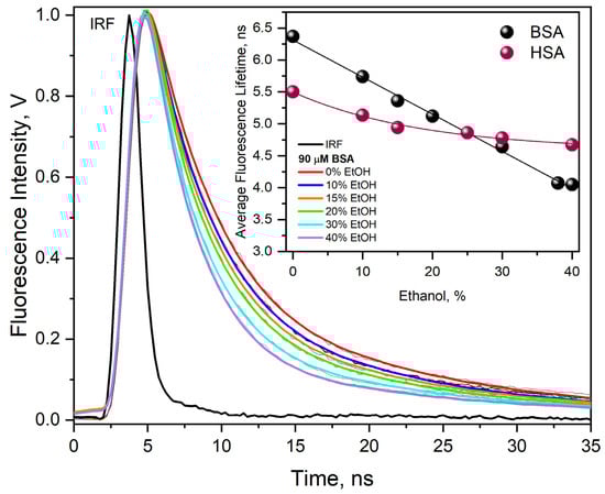 Decays of fluorescence of the neat BSA solution (90 µM), a solution of BSA (90 μM) containing various amounts of EtOH 0–40% (vol.), and biexponential best fits to experimental curves. IRF (instrument response function) for a 295 nm LED excitation source. Inset. The dependence of the average value of fluorescence lifetime of BSA or HSA as a function of EtOH concentration (0–40% vol.).