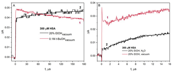 For a more detailed analysis of the reaction of the CH3C•HOH radical with HSA, we performed pulse radiolysis experiments under various conditions. Samples subjected to electron beam irradiation containing t-BuOH or EtOH as scavengers of •OH radicals were deaerated under vacuum. Under such conditions, the reactive species in the solution containing t-BuOH is the hydrated electron, and in the solution containing EtOH, there are both the hydrated electron and 1-hydroxyethyl radical (Figure 8A). The difference is in the intensity of absorption of the transient recorded (ΔA0) immediately after irradiation of the HSA solution containing t-BuOH (ΔA0 is about 0.05) or EtOH (ΔA0 is about 0.04).