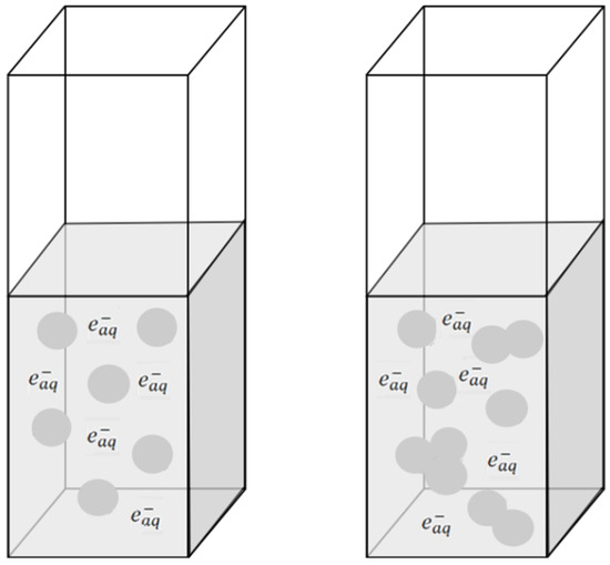 Schematic representation of electron scavenging by albumin: (left cuvette) without ethanol, the effective electron capture volume (circles) by n HSA molecules (distributed uniformly in solution is equal to n·Vaq where Vaq is the spherical capture volume of isolated HSA); (right cuvette) in the presence of ethanol the effective electron capture volume VEtOH is smaller than n·Vaq, which is caused by overlapping of the scavenging spheres of albumin molecules firmly sticked (non-uniform blobs).