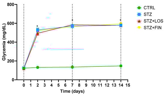 Before induction, the basal glycemia of the control and STZ-induced rats, treated and non-treated, was similar (CTRL: 122.75 ± 4.28 mg/dL vs. STZ: 125.5 ± 5.10 mg/dL vs. STZ+LOS: 119.13 ± 3.42 vs. STZ+FIN: 122.88 ± 6.50, n = 32 divided equally across the four experimental groups (n = 8 per group), p > 0.05) (Figure 1). Induced rats had their initial glycemia increased to 529.5 ± 20.76 mg/dL (STZ), 494.25 ± 20.73 mg/dL (STZ+LOS) and 523.38 ± 21.46 mg/dL (STZ+FIN) within 48 h (p < 0.0001), while in the control rats glycaemia was roughly the same within 48 h (131.63 ± 4.93 mg/dL; p > 0.05). At day 7 and day 14, almost all STZ rats presented glycemia above 600 mg/dL with ketone bodies, while control animals presented glycemic values of 142.5 ± 4.96 mg/dL on the 14th day. The glucometer used was selected because it could quantify blood glucose values up to 600 mg/dL, with values above this threshold being considered “HIGH”. In this study, for graphic purposes we considered all “HIGH” values to correspond to 600 mg/dL, a very high value which raises no doubt about the diabetic condition the animals were in throughout the protocol.