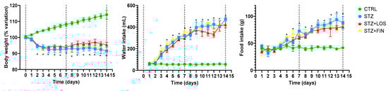 As expected, water intake was significantly higher in all diabetic groups than in the controls, which maintained a relatively constant water intake throughout the experimental protocol: 56.44 ± 3.53 mL/cage/day. All diabetic rats exhibited increased water consumption starting on day 3, with intake progressively rising throughout the protocol, eventually reaching levels more than seven times higher than those of the control group (at day 14: STZ: 472.75 ± 19.69 mL/cage/day; STZ+LOS: 423 ± 30.08 mL/cage/day; STZ+FIN: 415 ± 22.29 mL/cage/day).
