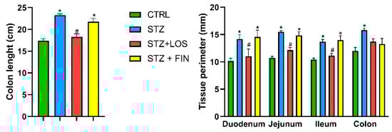 Macroscopic evaluation: colon length (cm) and tissue perimeter (mm) of duodenum, jejunum, ileum and colon of control (CTRL, n = 8), streptozotocin-induced diabetic rats (STZ, n = 8), streptozotocin-induced diabetic rats treated with losartan (STZ+LOS, n = 8) and streptozotocin-induced diabetic rats treated with finerenone (STZ+FIN, n = 8). Values are mean ± SD. * Statistical difference (p < 0.05) to CTRL; # Statistical difference (p < 0.05) to STZ.